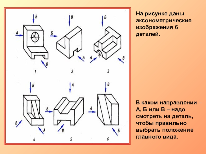 На рисунке даны аксонометрические изображения 6 деталей. В каком направлении – А, Б или В – надо