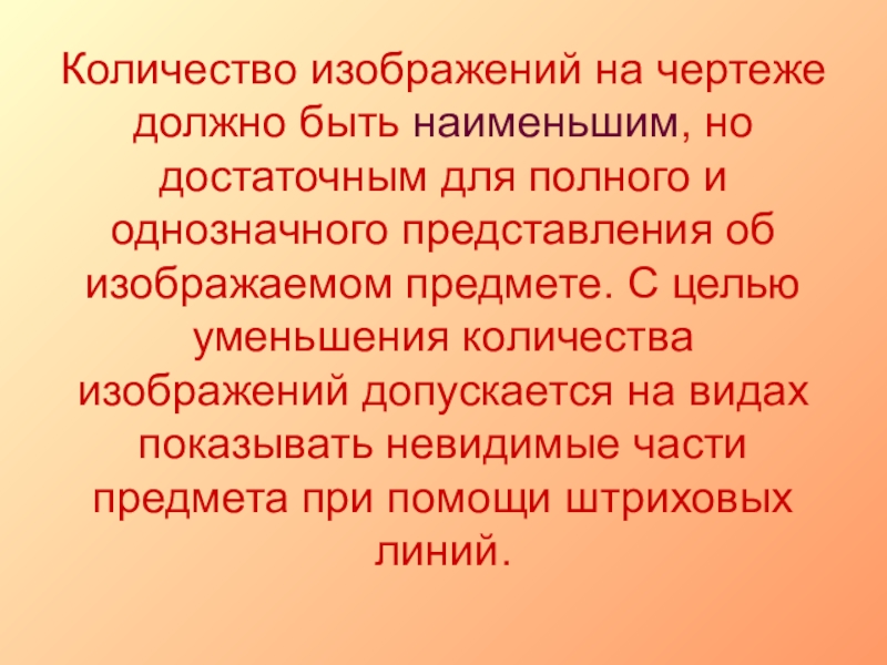 Слайд 9Количество изображений на чертеже должно быть наименьшим, но достаточным для полного