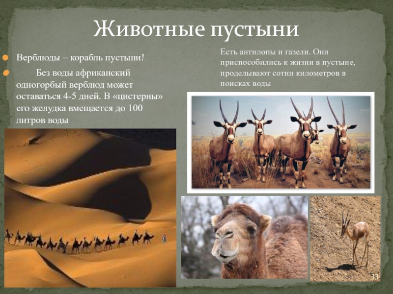 Есть антилопы и газели. Они приспособились к жизни в пустыне, проделывают сотни километров в поисках воды