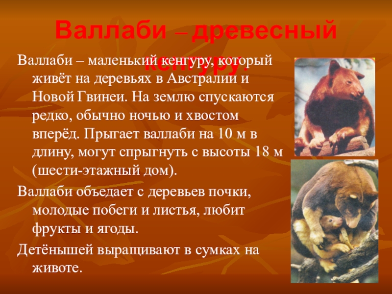 в Австралии и Новой Гвинеи. На землю спускаются редко, обычно ночью и хвостом вперёд. Прыгает валлаби на 10 м в длину, могут спрыгнуть с высоты 18 м (шести-этажный дом).