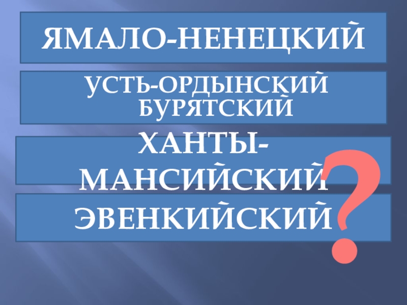 ЯМАЛО-НЕНЕЦКИЙУСТЬ-ОРДЫНСКИЙ БУРЯТСКИЙХАНТЫ-МАНСИЙСКИЙЭВЕНКИЙСКИЙ?