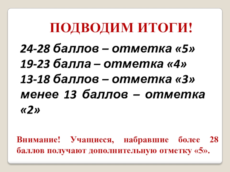 Внимание! Учащиеся, набравшие более 28 баллов получают дополнительную отметку «5».