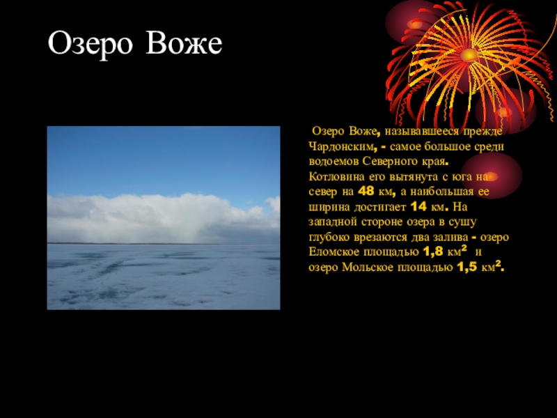 большое среди водоемов Северного края. Котловина его вытянута с юга на север на 48 км, а наибольшая ее ширина достигает 14 км. На западной стороне озера в сушу глубоко врезаются два залива - озеро Еломское площадью 1,8 км2 и озеро Мольское площадью 1,5 км2.