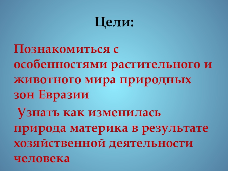 Цели:Познакомиться с особенностями растительного и животного мира природных зон Евразии Узнать как изменилась природа материка в результате