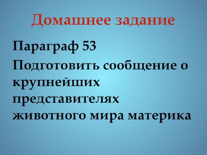 Домашнее заданиеПараграф 53Подготовить сообщение о крупнейших представителях животного мира материка
