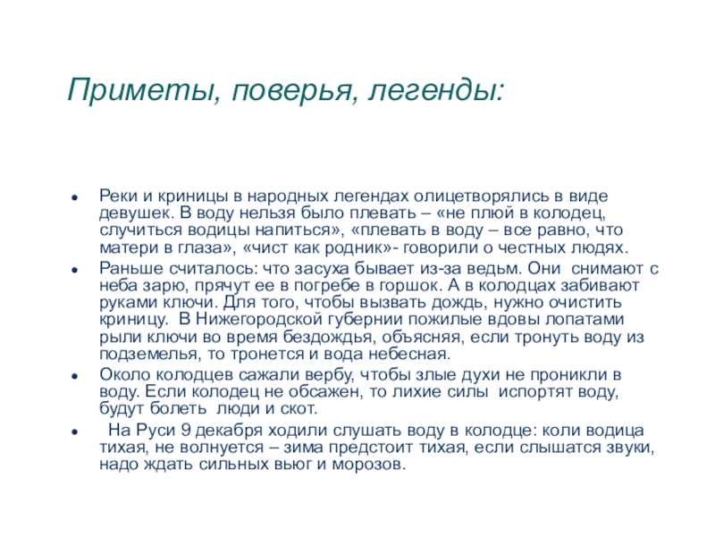 девушек. В воду нельзя было плевать – «не плюй в колодец, случиться водицы напиться», «плевать в воду – все равно, что матери в глаза», «чист как родник»- говорили о честных людях.
