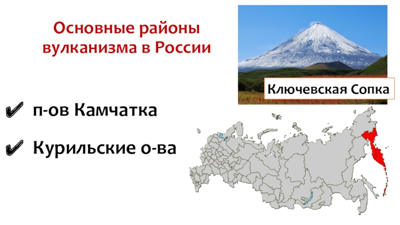 Основные районы вулканизма в Россиип-ов КамчаткаКурильские о-ваКлючевская Сопка