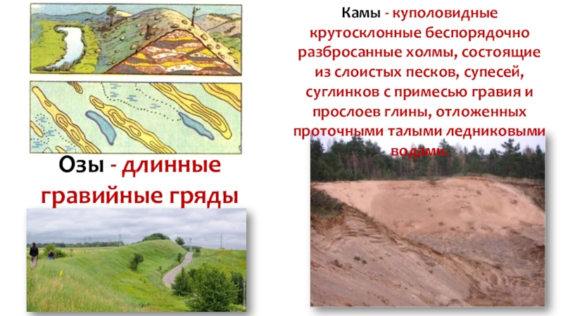 Озы - длинные гравийные грядыКамы - куполовидные крутосклонные беспорядочно разбросанные холмы, состоящие из слоистых песков, супесей, суглинков