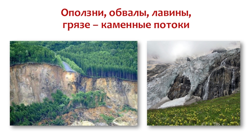Слайд 8Оползни, обвалы, лавины, грязе – каменные потоки