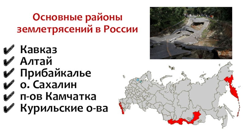 Основные районы землетрясений в РоссииКавказАлтайПрибайкальео. Сахалинп-ов КамчаткаКурильские о-ва
