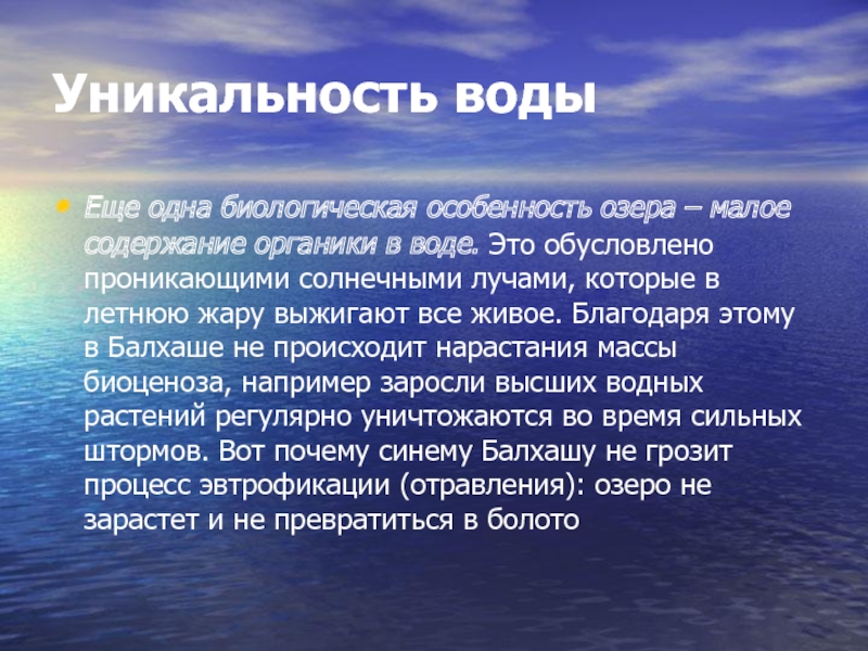 Г) Малое содержание органики в воде. (выжигают солнечные лучи). Балхашу не грозит процесс эвтрофикации (отравления): озеро не зарастет и не превратиться в болото.