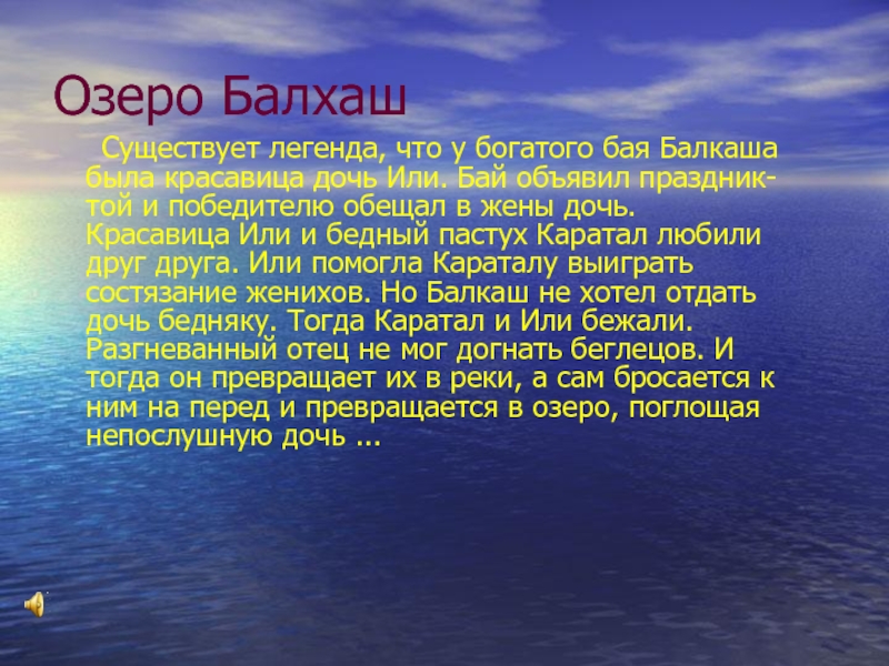 Балкаша была красавица дочь Или. Бай объявил праздник- той и победителю обещал в жены дочь. Красавица Или и бедный пастух Каратал любили друг друга. Или помогла Караталу выиграть состязание женихов. Но Балкаш не хотел отдать дочь бедняку. Тогда Каратал и Или бежали. Разгневанный отец не мог догнать беглецов. И тогда он превращает их в реки, а сам бросается к ним на перед и превращается в озеро, поглощая непослушную дочь ...