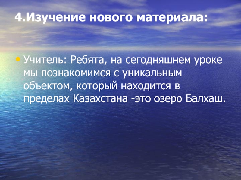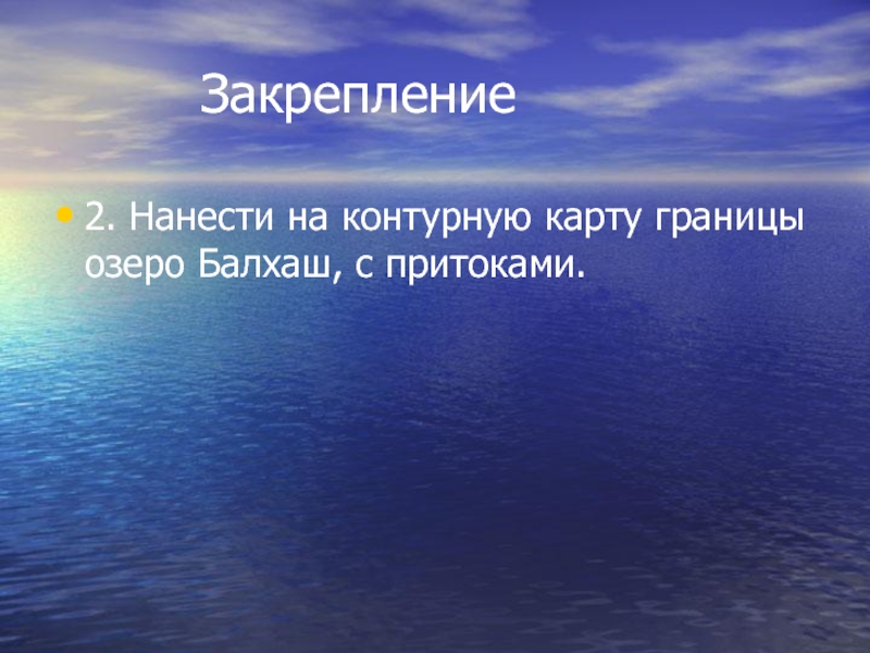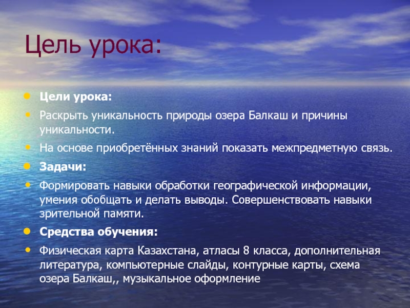 Физическая карта Казахстана, атласы 8 класса, дополнительная литература, компьютерные слайды, контурные карты, схема озера Балкаш,, музыкальное оформление