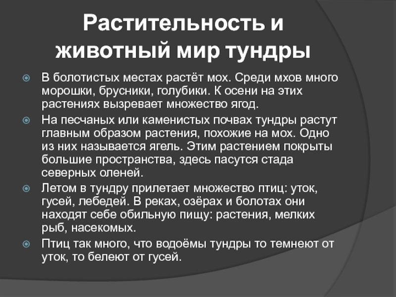 Растительность и животный мир тундры В болотистых местах растёт мох. Среди мхов много морошки, брусники, голубики. К