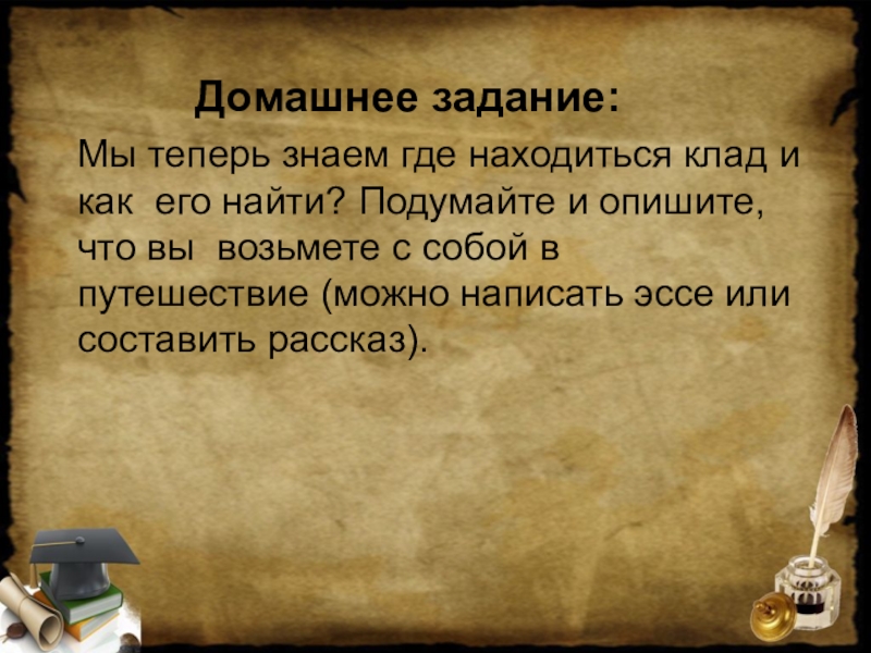 находиться клад и как его найти? Подумайте и опишите, что вы возьмете с собой в путешествие (можно написать эссе или составить рассказ).
