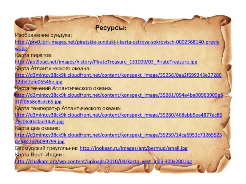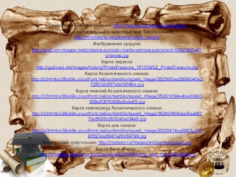 Схема океанических течений: http://myphysiography.ru/img/72.jpgСтатья растительный и животный мир Тихого океана: http://mirokeana.selgatrend.ru/tihij_okean/Изображение сундука:http://prv0.lori-images.net/piratskie-sunduki-i-karta-ostrova-sokrovisch-0002368140-preview.jpgКарта пиратов: http://go2load.net/images/history/PirateTreasure_151009/02_PirateTreasure.jpgКарта Атлантического океана: http://d3mlntcv38ck9k.cloudfront.net/content/konspekt_image/35256/0aa2f699343e2728032d5f7efe06546e.jpgКарта