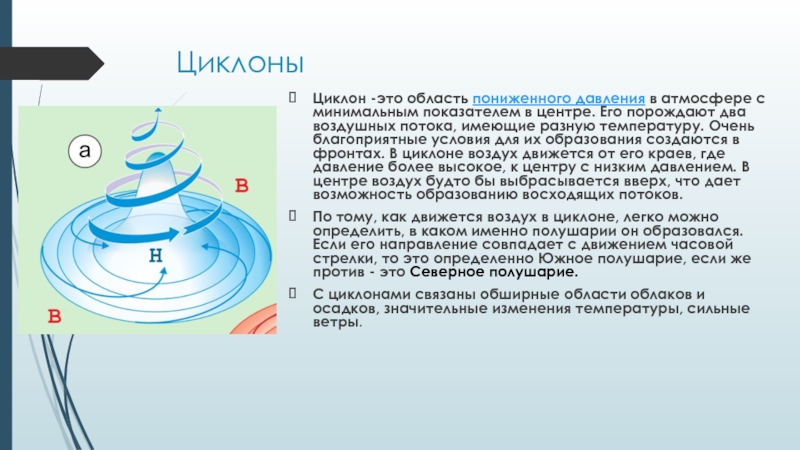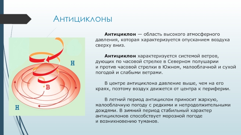 в антициклоне воздух не насыщается влагой, облакообразование не происходит и преобладает малооблачная и сухая погода со слабыми ветрами и штилями.