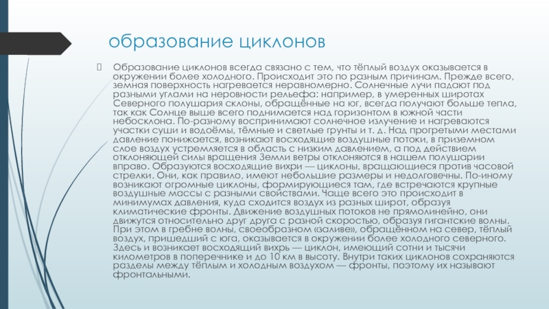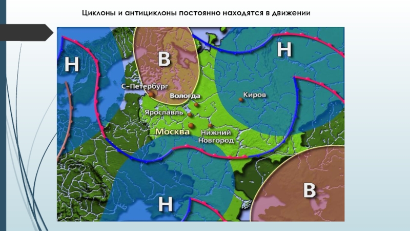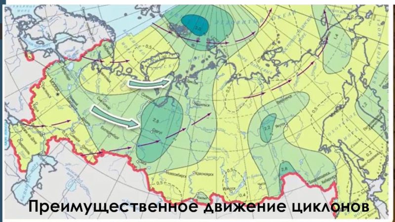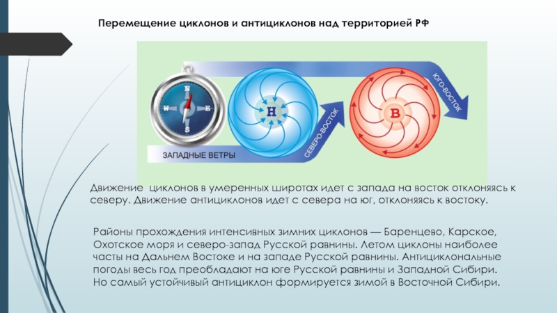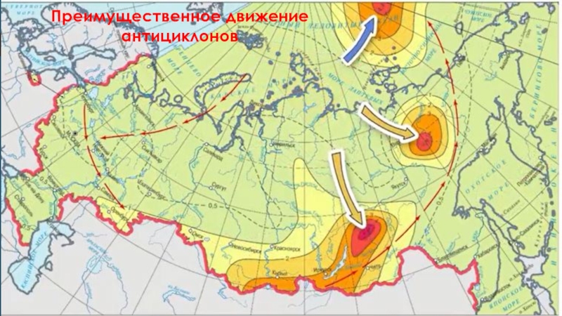 Районы прохождения интенсивных зимних циклонов — Баренцево, Карское, Охотское моря и северо-запад Русской равнины. Летом циклоны наиболее часты на Дальнем Востоке и на западе Русской равнины. Антициклональные погоды весь год преобладают на юге Русской равнины и Западной Сибири. Но самый устойчивый антициклон формируется зимой в Восточной Сибири.