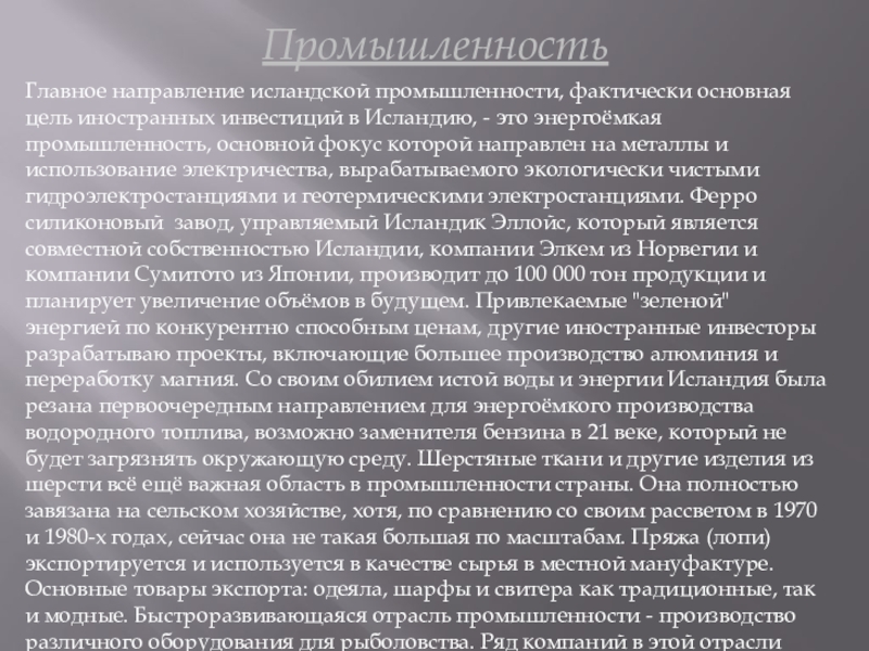 Главное направление исландской промышленности, фактически основная цель иностранных инвестиций в Исландию, - это энергоёмкая промышленность, основной фокус которой направлен на металлы и использование электричества, вырабатываемого экологически чистыми гидроэлектростанциями и геотермическими электростанциями. Ферро силиконовый завод, управляемый Исландик Эллойс, который является совместной собственностью Исландии, компании Элкем из Норвегии и компании Сумитото из Японии, производит до 100 000 тон продукции и планирует увеличение объёмов в будущем. Привлекаемые "зеленой" энергией по конкурентно способным ценам, другие иностранные инвесторы разрабатываю проекты, включающие большее производство алюминия и переработку магния. Со своим обилием истой воды и энергии Исландия была резана первоочередным направлением для энергоёмкого производства водородного топлива, возможно заменителя бензина в 21 веке, который не будет загрязнять окружающую среду. Шерстяные ткани и другие изделия из шерсти всё ещё важная область в промышленности страны. Она полностью завязана на сельском хозяйстве, хотя, по сравнению со своим рассветом в 1970 и 1980-х годах, сейчас она не такая большая по масштабам. Пряжа (лопи) экспортируется и используется в качестве сырья в местной мануфактуре. Основные товары экспорта: одеяла, шарфы и свитера как традиционные, так и модные. Быстроразвивающаяся отрасль промышленности - производство различного оборудования для рыболовства. Ряд компаний в этой отрасли являются мировыми лидерами. Новейшие технологии и консультационные услуги - ещё один отросток процветающего сектора исландской рыболовной технологии. Развиты области компьютерного программного обеспечения и биотехнологии. Конкурентно-способными являются отрасли, производящие краску, мебель, кондитерские изделия, моющие средства, стройматериалы, и т.д. Некоторые