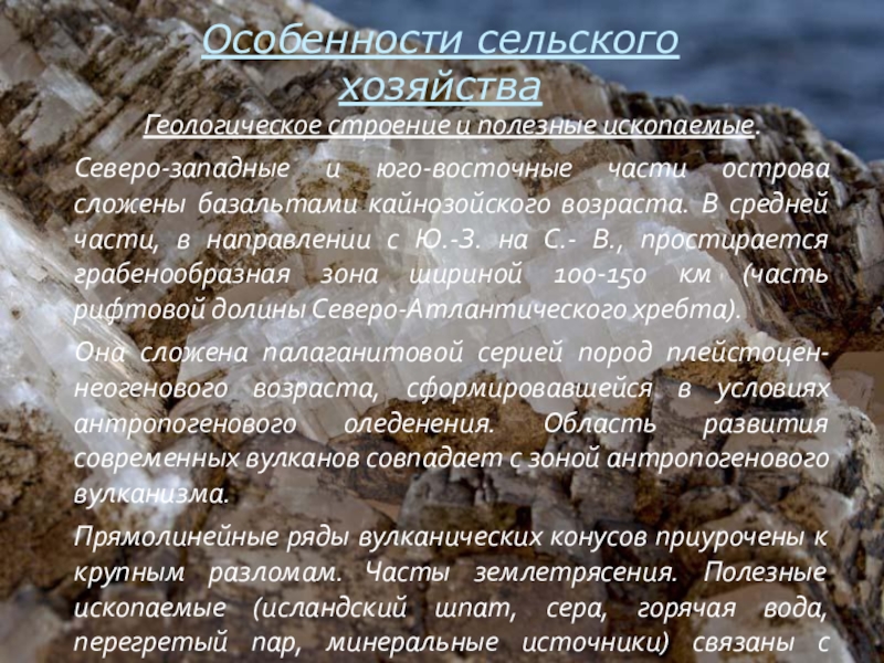 Прямолинейные ряды вулканических конусов приурочены к крупным разломам. Часты землетрясения. Полезные ископаемые (исландский шпат, сера, горячая вода, перегретый пар, минеральные источники) связаны с вулканизмом. Небольшие месторождения торфа, лигнита и др.