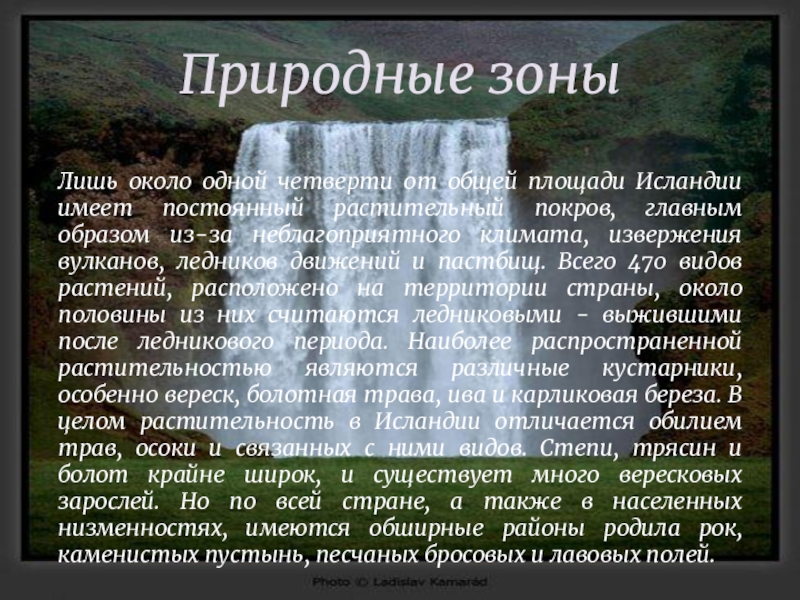 растительный покров, главным образом из-за неблагоприятного климата, извержения вулканов, ледников движений и пастбищ. Всего 470 видов растений, расположено на территории страны, около половины из них считаются ледниковыми - выжившими после ледникового периода. Наиболее распространенной растительностью являются различные кустарники, особенно вереск, болотная трава, ива и карликовая береза. В целом растительность в Исландии отличается обилием трав, осоки и связанных с ними видов. Степи, трясин и болот крайне широк, и существует много вересковых зарослей. Но по всей стране, а также в населенных низменностях, имеются обширные районы родила рок, каменистых пустынь, песчаных бросовых и лавовых полей.