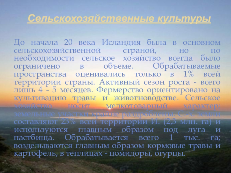 но по необходимости сельское хозяйство всегда было ограничено в объеме. Обрабатываемые пространства оценивались только в 1% всей территории страны. Активный сезон роста - всего лишь 4 - 5 месяцев. Фермерство ориентировано на культивацию травы и животноводстве. Сельское хозяйство носит мелкотоварный характер; земельные участки крайне раздроблены. С.-х. земли составляют 23% всей территории И. (2,3 млн. га) и используются главным образом под луга и пастбища. Обрабатывается всего 1 тыс. га; возделываются главным образом кормовые травы и картофель, в теплицах - помидоры, огурцы.