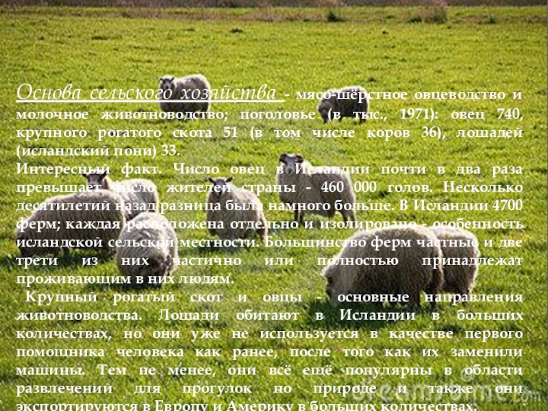 тыс., 1971): овец 740, крупного рогатого скота 51 (в том числе коров 36), лошадей (исландский пони) 33.