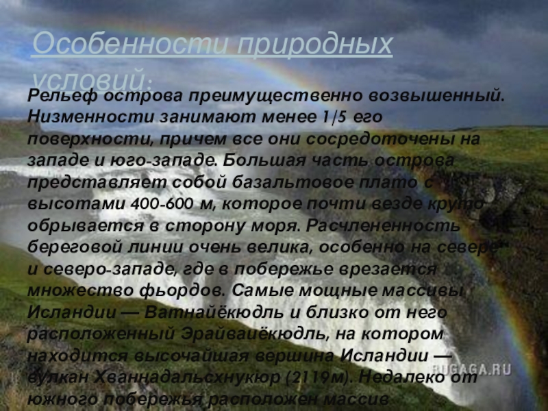 поверхности, причем все они сосредоточены на западе и юго-западе. Большая часть острова представляет собой базальтовое плато с высотами 400-600 м, которое почти везде круто обрывается в сторону моря. Расчлененность береговой линии очень велика, особенно на севере и северо-западе, где в побережье врезается множество фьордов. Самые мощные массивы Исландии — Ватнайёкюдль и близко от него расположенный Эрайваиёкюдль, на котором находится высочайшая вершина Исландии — вулкан Хваннадальсхнукюр (2119м). Недалеко от южного побережья расположен массив Мирдальсиёкюдль (1480 м), в центральной части острова — массив Хофсйёкюдль (1700 м) и др. Вершины массивов образуют действующие или потухшие вулканы. В юго-западной части острова поднимается наиболее активный вулкан Исландии — Гекла, достигающий высоты 1491 м.
