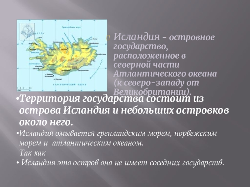 Слайд 3Исландия - островное государство, расположенное в северной части Атлантического океана (к