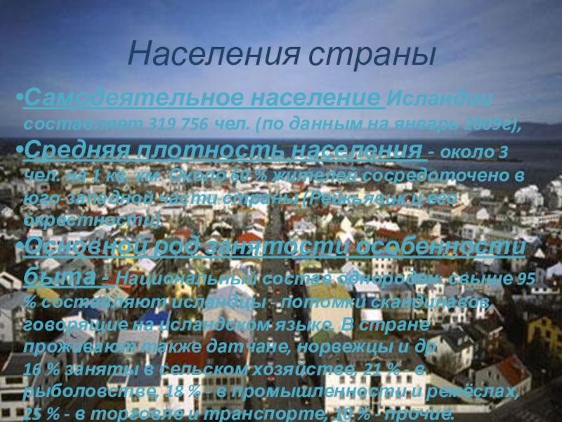 Основной род занятости особенности быта - Национальный состав однороден: свыше 95 % составляют исландцы - потомки скандинавов, говорящие на исландском языке. В стране проживают также датчане, норвежцы и др