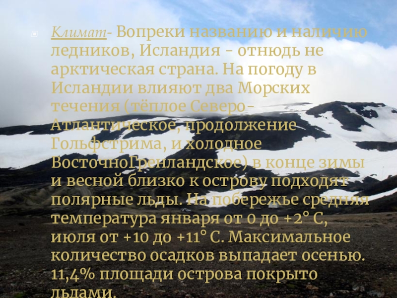страна. На погоду в Исландии влияют два Морских течения (тёплое Северо-Атлантическое, продолжение Гольфстрима, и холодное ВосточноГренландское) в конце зимы и весной близко к острову подходят полярные льды. На побережье средняя температура января от 0 до +2° С, июля от +10 до +11° С. Максимальное количество осадков выпадает осенью. 11,4% площади острова покрыто льдами.