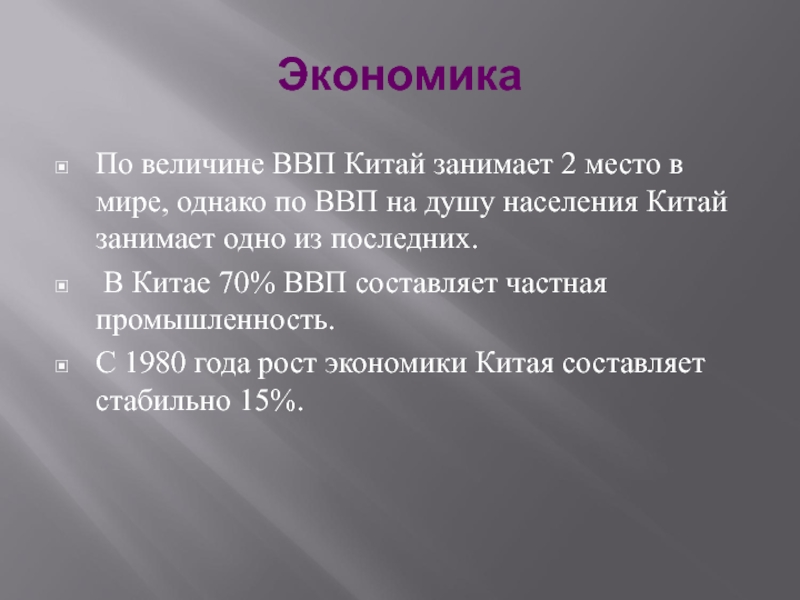 ЭкономикаПо величине ВВП Китай занимает 2 место в мире, однако по ВВП на душу населения Китай занимает