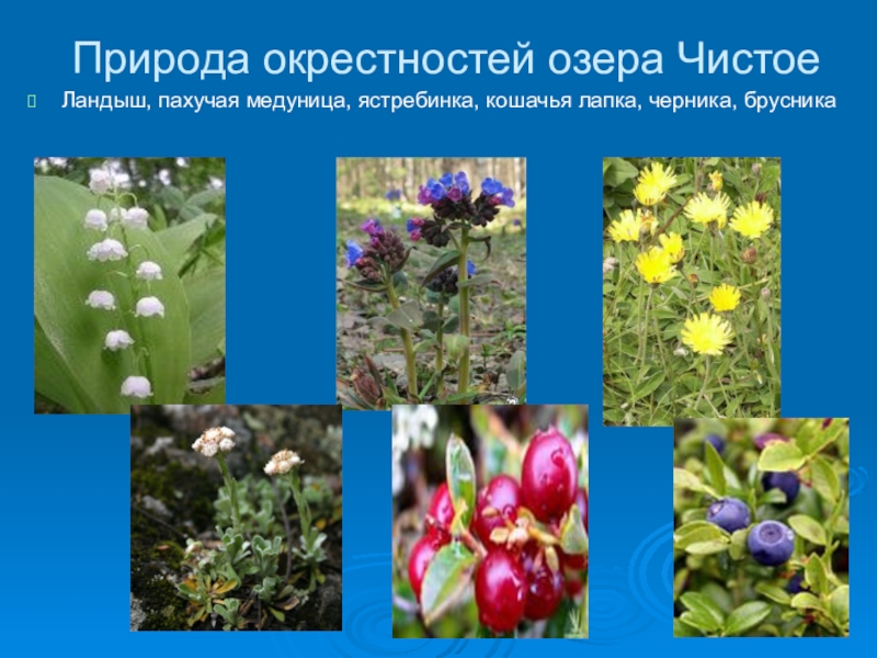 Ландыш, пахучая медуница, ястребинка, кошачья лапка, черника, брусника