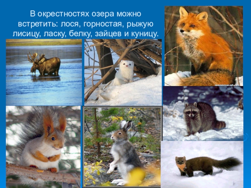 Слайд 19В окрестностях озера можно встретить: лося, горностая, рыжую лисицу, ласку, белку,
