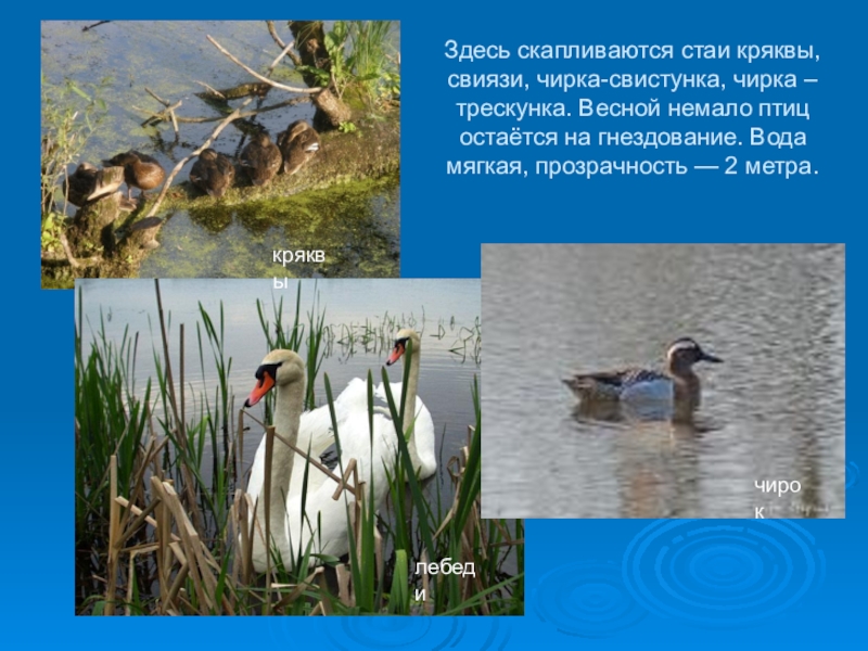 Слайд 8Здесь скапливаются стаи кряквы, свиязи, чирка-свистунка, чирка – трескунка. Весной немало