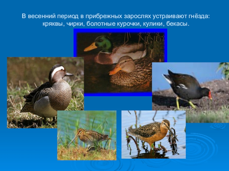 Слайд 17В весенний период в прибрежных зарослях устраивают гнёзда: кряквы, чирки, болотные