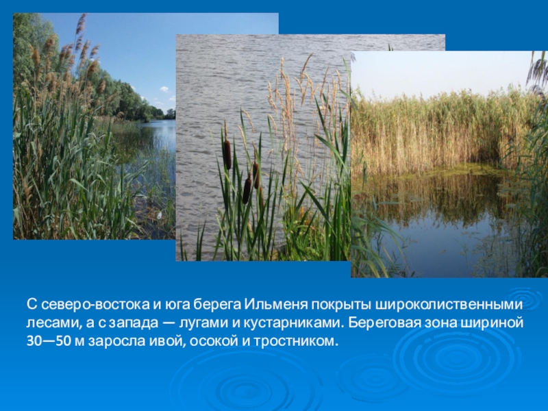 запада — лугами и кустарниками. Береговая зона шириной 30—50 м заросла ивой, осокой и тростником.