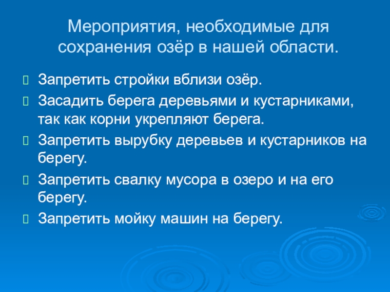 Слайд 22Мероприятия, необходимые для сохранения озёр в нашей области.