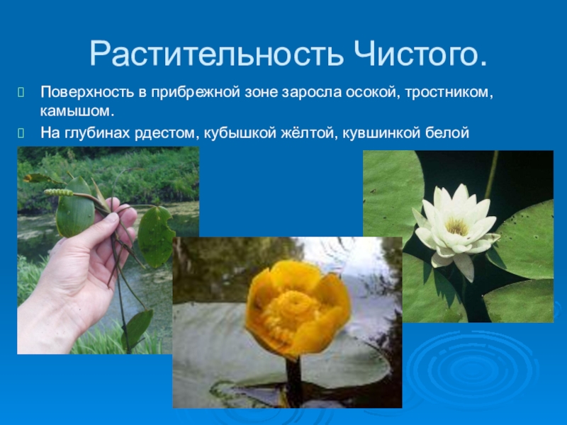 Поверхность в прибрежной зоне заросла осокой, тростником, камышом.