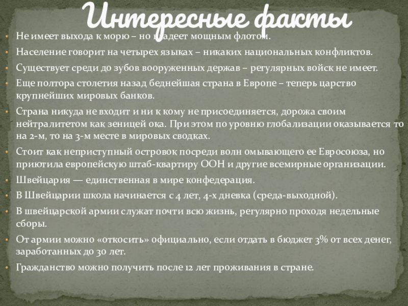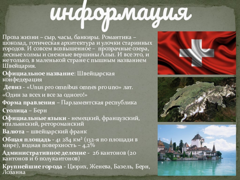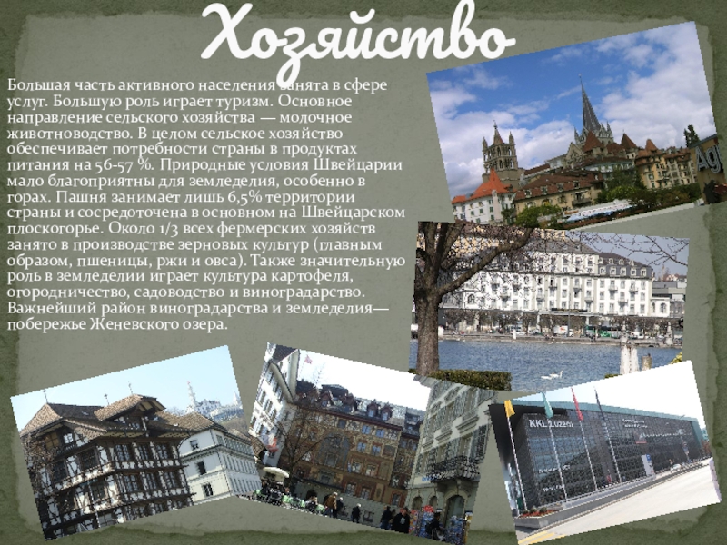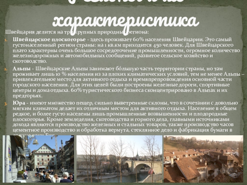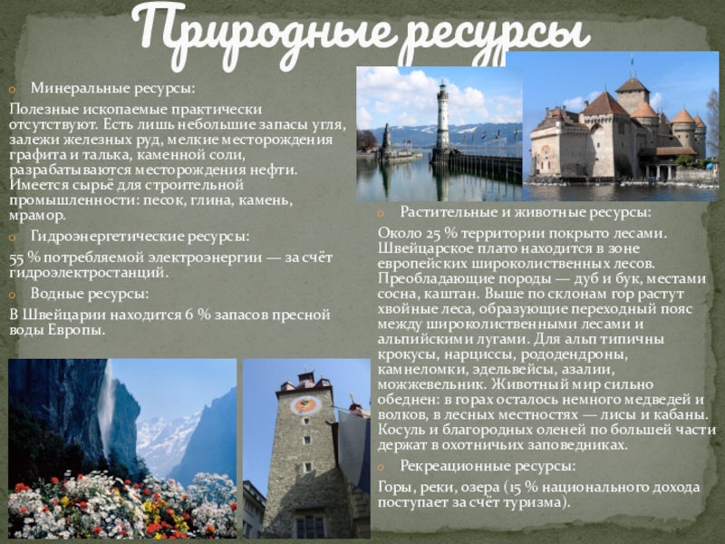 Горы, реки, озера (15 % национального дохода поступает за счёт туризма).