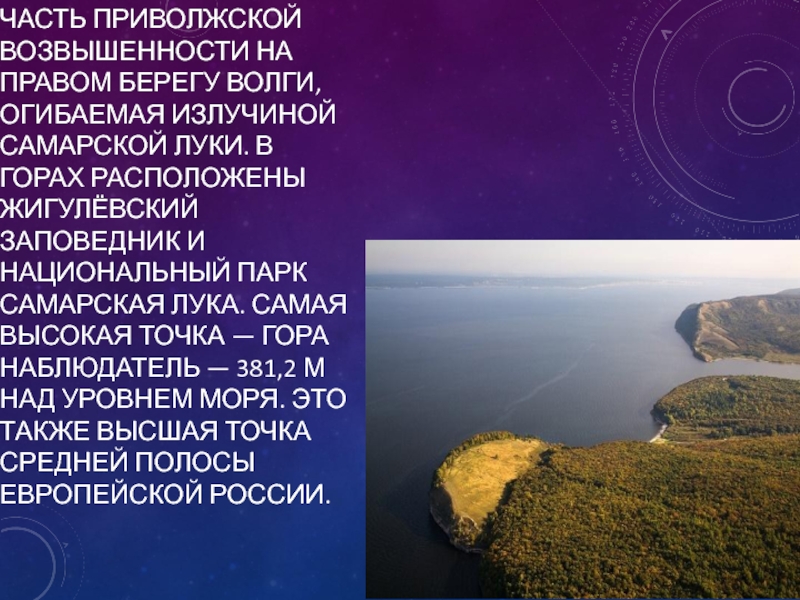 излучиной Самарской Луки. В горах расположены Жигулёвский заповедник и национальный парк Самарская Лука. Самая высокая точка — гора Наблюдатель — 381,2 м над уровнем моря. Это также высшая точка средней полосы Европейской России.