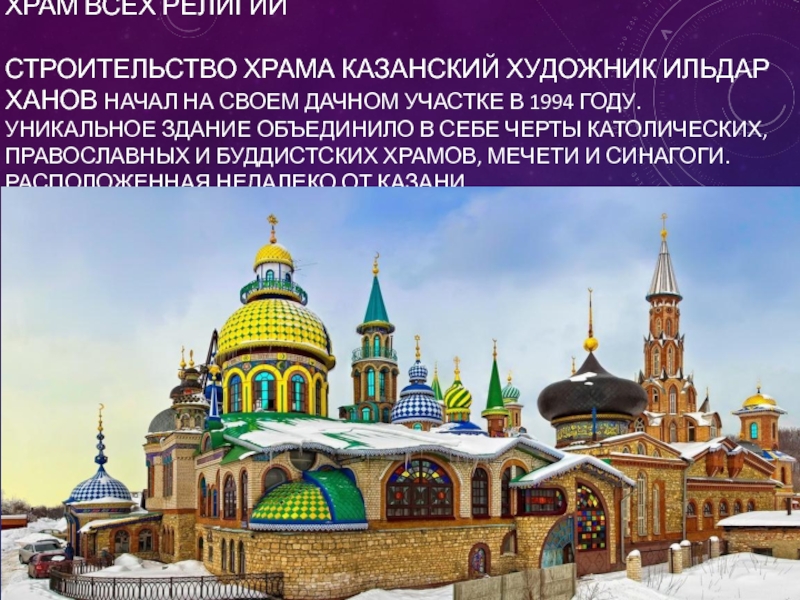 дачном участке в 1994 году. Уникальное здание объединило в себе черты католических, православных и буддистских храмов, мечети и синагоги. Расположенная недалеко от Казани.