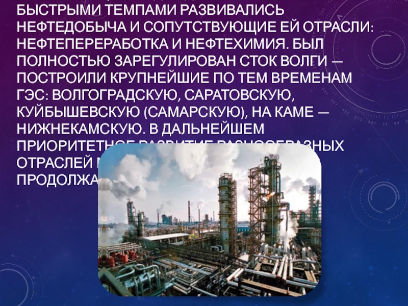 нефтедобыча и сопутствующие ей отрасли: нефтепереработка и нефтехимия. Был полностью зарегулирован сток Волги — построили крупнейшие по тем временам ГЭС: Волгоградскую, Саратовскую, Куйбышевскую (Самарскую), на Каме — Нижнекамскую. В дальнейшем приоритетное развитие разнообразных отраслей машиностроения будет продолжаться.