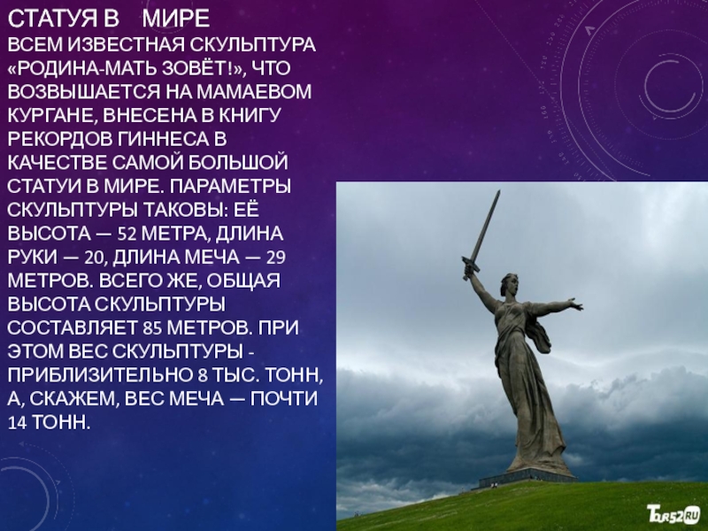 «Родина-мать зовёт!», что возвышается на Мамаевом кургане, внесена в книгу рекордов Гиннеса в качестве самой большой статуи в мире. Параметры скульптуры таковы: её высота — 52 метра, длина руки — 20, длина меча — 29 метров. Всего же, общая высота скульптуры составляет 85 метров. При этом вес скульптуры - приблизительно 8 тыс. тонн, а, скажем, вес меча — почти 14 тонн.