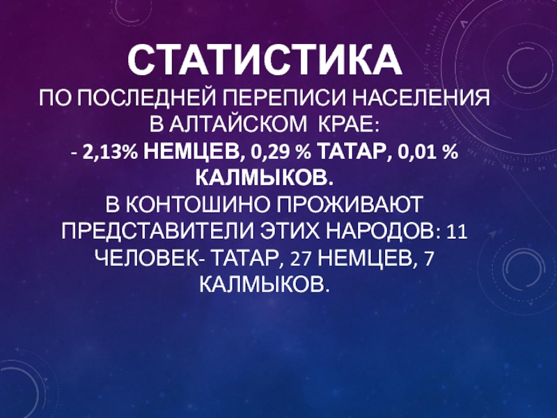 В Контошино проживают представители этих народов: 11 человек- татар, 27 немцев, 7 калмыков.