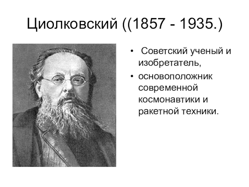 Циолковский ((1857 - 1935.) Советский ученый и изобретатель, основоположник современной космонавтики и ракетной техники.