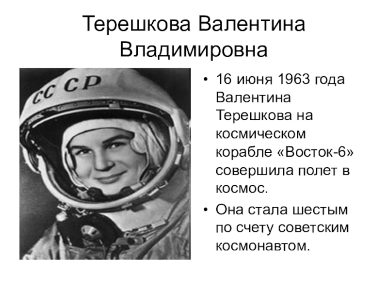 Терешкова Валентина Владимировна16 июня 1963 года Валентина Терешкова на космическом корабле «Восток-6» совершила полет в космос. Она
