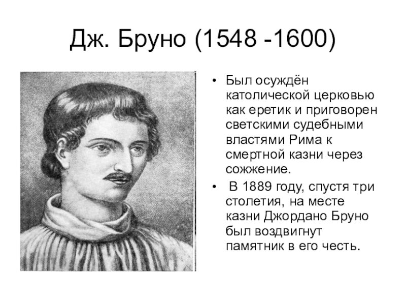 Дж. Бруно (1548 -1600)Был осуждён католической церковью как еретик и приговорен светскими судебными властями Рима к смертной
