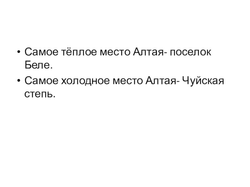 Самое тёплое место Алтая- поселок Беле.Самое холодное место Алтая- Чуйская степь.