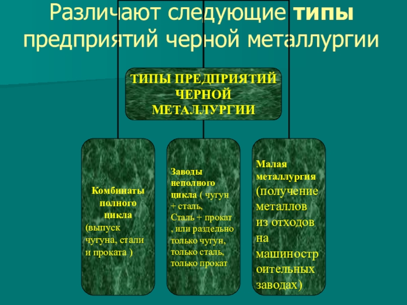 Комбинат полного цикла – комбинат с последующей обработкой сырья, включающий в себя три стадии металлургии: производство чугуна – производство стали – производство проката